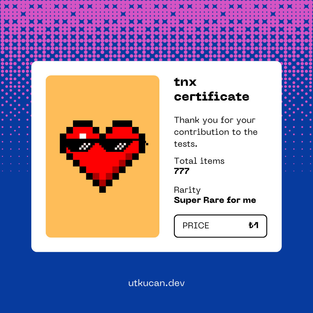Denemelerime, testlerime ve öğrenme sürecime katkın için kocaman bir teşekkür! TNX Certificate, bu katkının dijital bir simgesi. Daha geniş bir topluluk için tasarlanmış ve 777 adetle sınırlı. Fiyatı sembolik olsa da manevi değeri oldukça büyük. Bu sertifika ile destek verdiğini görünür kılabilirsin.